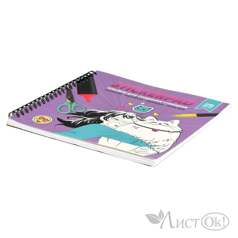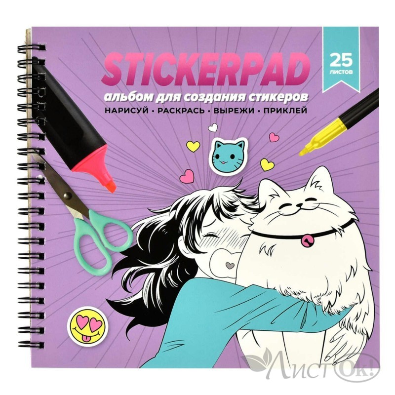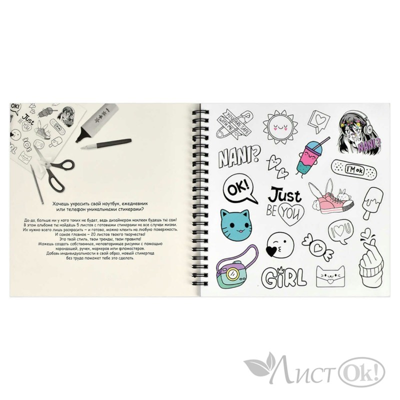 Альбом для создания стикеров 25 л., арт. 65018 / 20 МАНГА (назначение: карандаши, маркеры; размер: 195x195 мм; мягкий переплёт (евроспираль открытая), материал обложки: картон переплётный 950 г/м?, мелованный картон 190 г/м?; вн. блок белая самоклеящаяся бумага: 25 л., 80 г/м?, красочность форзаца: печать в одну краску; особенности: блок состоит из 5-ти листов со стикерами + 20 чистых листов; индивидуальная упаковка: ПЭТ-пакет)