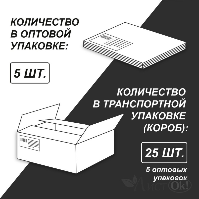 Альбомы упакованы в термоусадочную пленку по 5 штук (ассорти, по 1 альбому каждого дизайна). В коробе находится 5 упаковок, 25 шт.