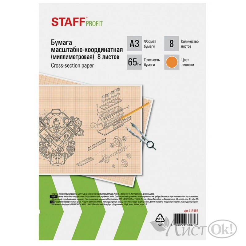 Бумага формата А3 (297х420 мм) и плотностью 65 г/м2 на скобе, 8 листов. Цвет линовки - оранжевый. Отличается четкими линиями и точной миллиметровой разметкой.