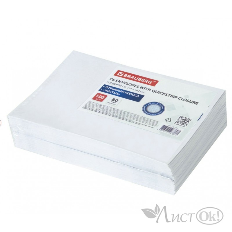 Конверт 114х162мм С6 отрывная лента, внутренняя запечатка, 80 г/м2, 80г/м2, (1/100) 112190 Brauberg