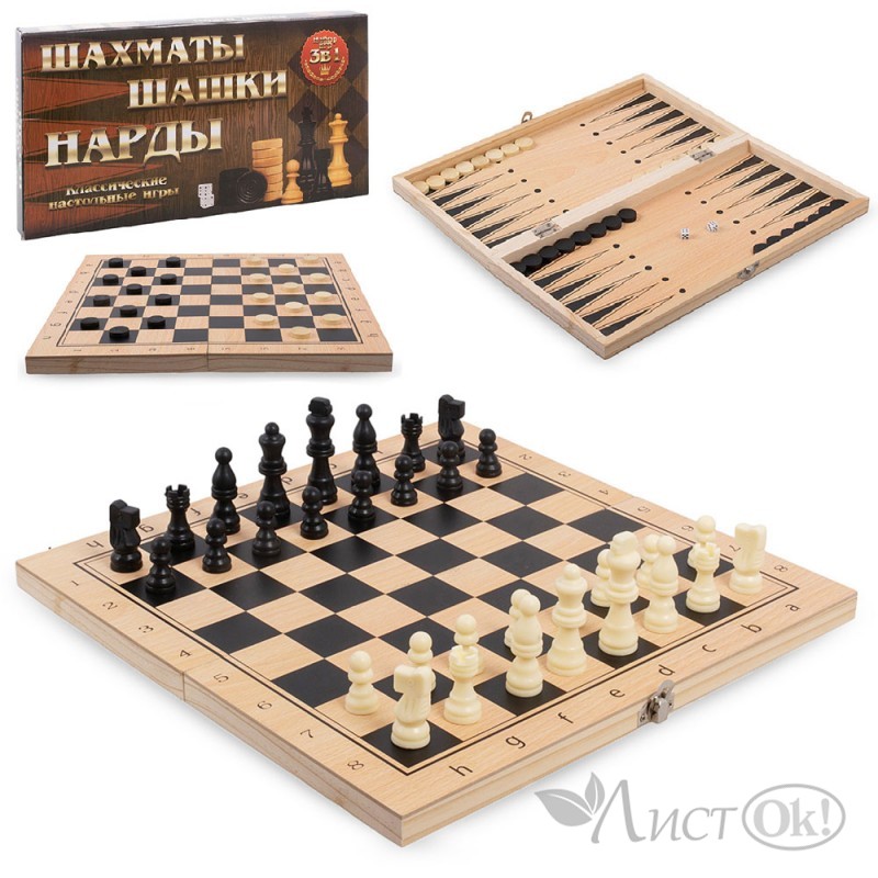 Классическая игра 3 в 1: шахматы, шашки и нарды - истинное богатство игр для настоящих ценителей настольных игр. С набором 3 в 1 вы получите все эти увлекательные игры в одном комплекте! Набор разработан как для взрослых, так и для детей от 3 лет, чтобы каждый мог насладиться часами интеллектуального развлечения. Доска изготовлена из прочного дерева и имеет в разложенном виде удобный размер 34 х 34, что делает этот набор идеальным выбором для игры дома, во время путешествий или на открытом воздухе. Шахматы - это игра стратегии и ума, где вы можете испытать свои способности в планировании и прогнозировании ходов противника. Шашки - классическая игра, требующая логики и тактики, чтобы сбить все фишки противника. Нарды - азартная игра, где нужно выдержать скорость и точность в перемещении фишек. Этот набор 3 в 1 - отличный подарок для друзей и семьи. Он не только добавит удовольствия в вашу жизнь, но и позволит провести незабываемое время вместе, обсуждая стратегии и ходы игры. Шахматное поле, фигуры, фишки выполнены из дерева. Также в наборе есть деревянное поле для игры в нарды и фишки к нему, кубики и шашки. В комплекте: игровое поле, шахматы, шашки, кубики. Размеры: игровое поле 34х2х34 см, шашки 2х2 см., фигурки от 3 до 7 см., кубик 0,8х0,8х0,8 см. Комплектация: игровое поле 1 шт., кубики 2 шт., шашки 30 шт., фигурки 32 шт.