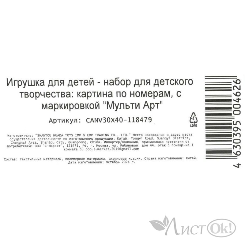 Размер основы: 30 х 40 см. Состав: картон + пластмасса.