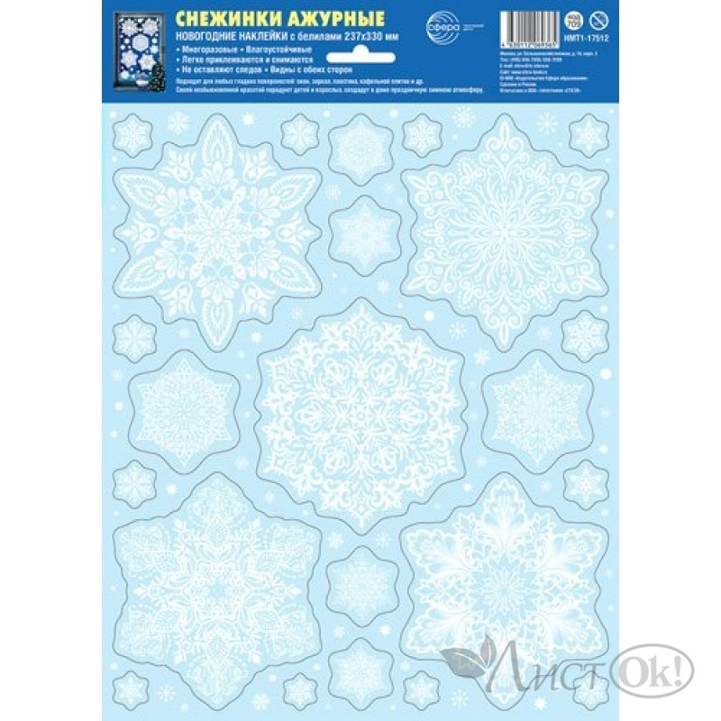 Наклейки - Новогодние на окна "Снежинки ажурные" А4+ белила, многоразовые НМТ1-17512 Сфера