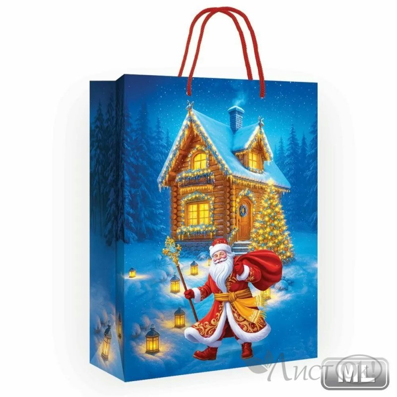 Подарочный пакет «Дед Мороз и зайцы» в размере МL поможет красиво и празднично упаковать любой новогодний подарок. Волшебный дизайн сделает поздравление особенным и оригинальным. На одной стороне пакета изображен добрый Дедушка Мороз, который звездной ночью пришел к по-рождественски украшенному домику с подарками. На другой стороне как будто бы задний двор этого домика. Такое дизайнерское решение словно погружает в новогоднюю сказку! Все цвета яркие и гармонично сочетаются между собой. Изделие выполнено из прочного мелованной бумаги высшего качества. Прочные ручки надежно выдержат любой вес. Внутрь такого пакета можно поместить коробки с подарками, конфеты, свертки и многое другое.
