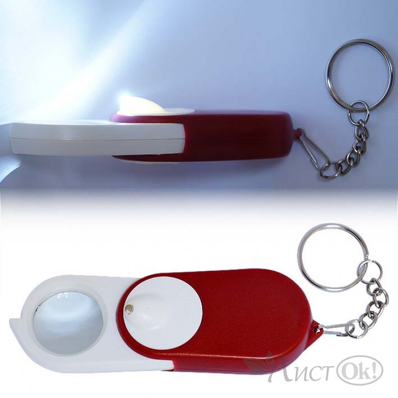 Линзы полностью помещаются в чехол. К чехлу крепится цепочка с кольцом – получается брелок с лупой. Подсветка состоит из 1 яркого светодиода.