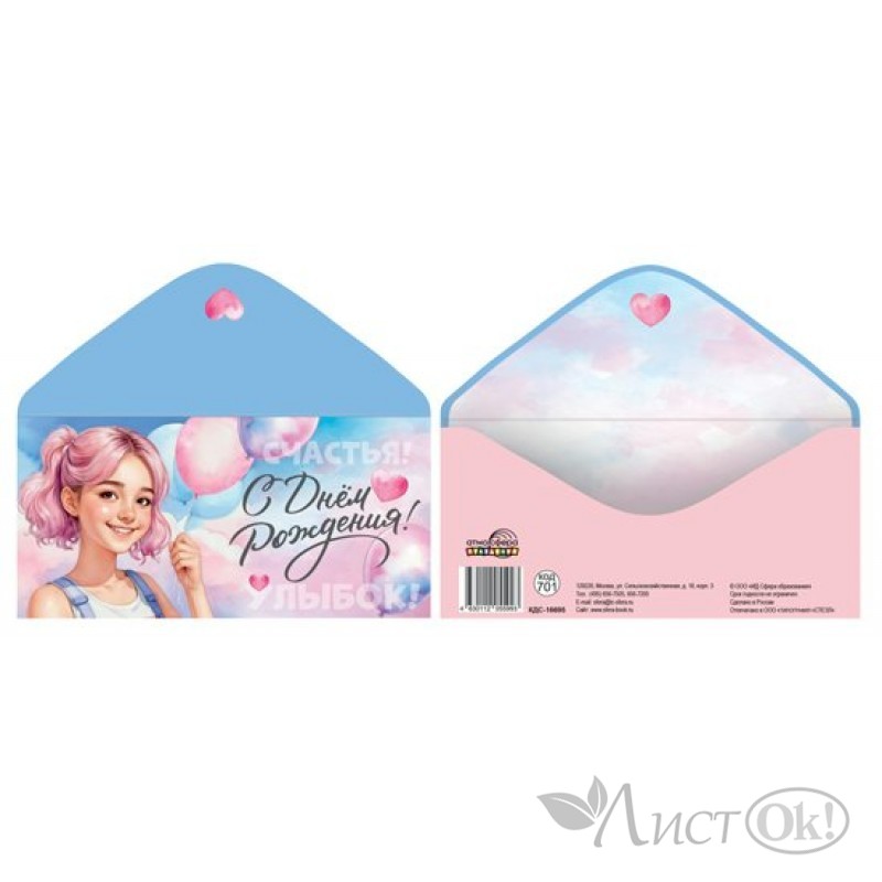 Открытка-конверт для денег поможет красиво оформить подарок ребенку на его день рождения. Конверт выполнен из плотного картона, поэтому надолго сохранит свой нарядный внешний вид.