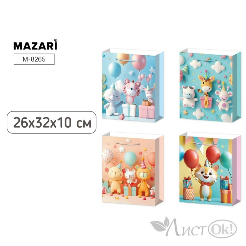 Пакет подарочный бумага 26*32*10 см, ДЕТСКИЙ, 4 дизайна в ассортименте M-8265 MAZARI
