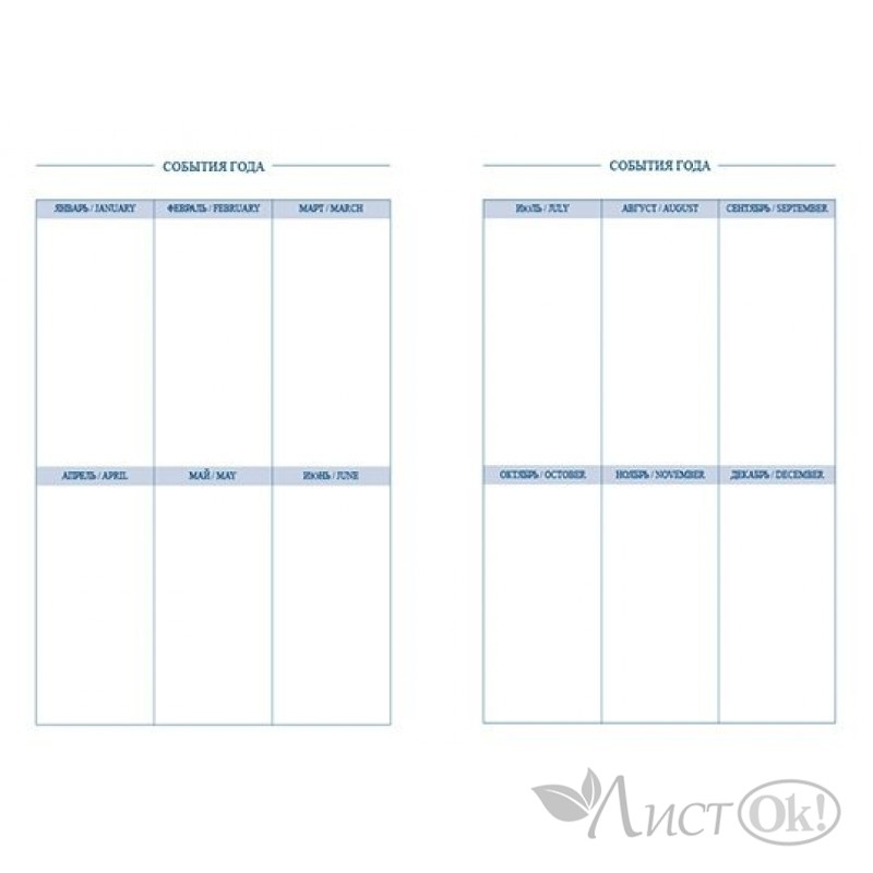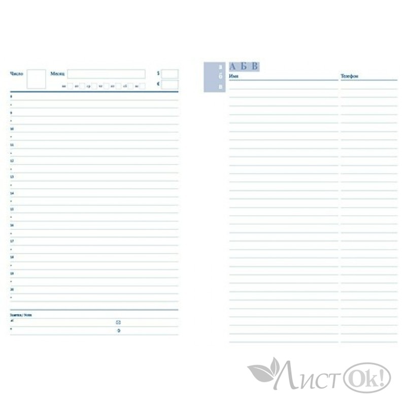 Ежедневник недатированный, 256 страниц, формат А5, твердый переплет, плотность 65 гр/м2. Внутренний блок - высококачественная офсетная белая бумага. Информационно-справочный блок включает календарь, международные и внутрироссийские телефонные коды, размеры одежды, праздничные даты. Почасовая разбивка дня для максимально точного планирования. День и месяц проставляется вручную. Строгая архитектура, печать в одну краску - голубым цветом. Обложка - 7БЦ, полноцветная печать с глянцевой ламинацией.