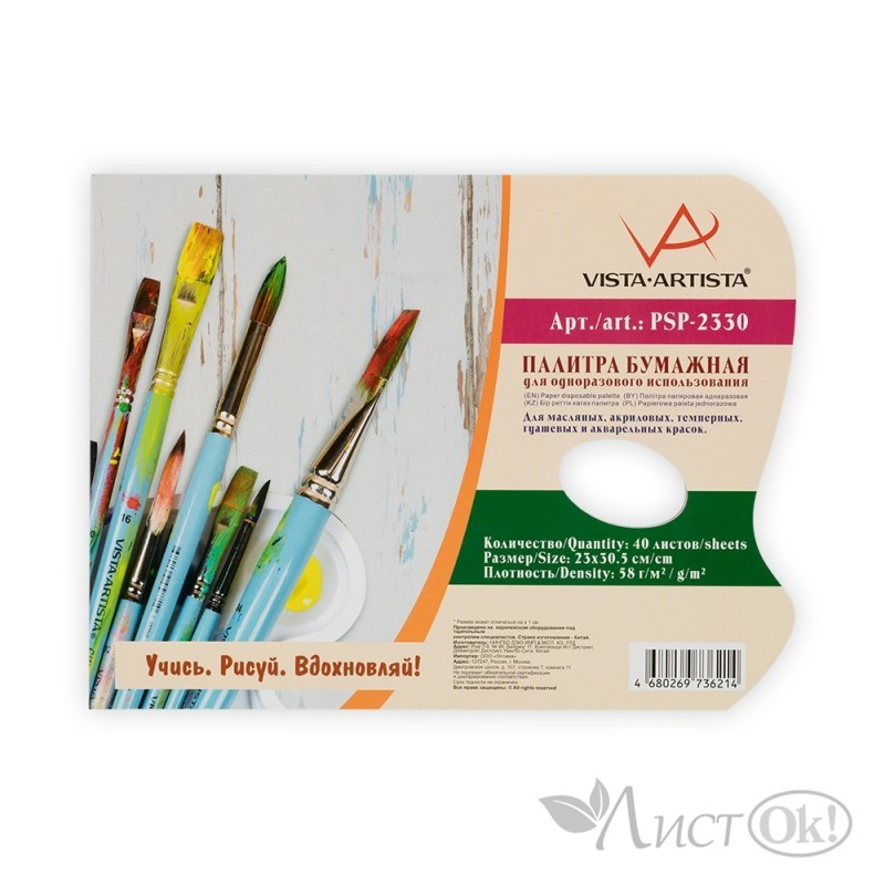 Палитра бумажная 40 л. (23х30.5 см) прямоугольная, PSP-2330 "VISTA-ARTISTA"
