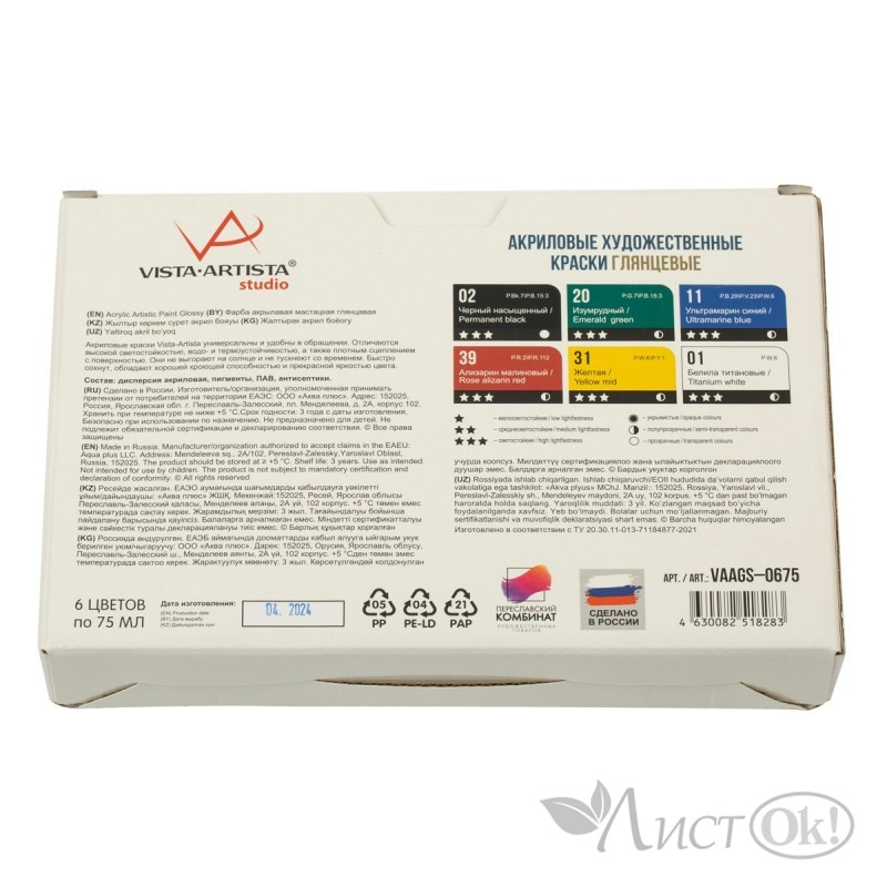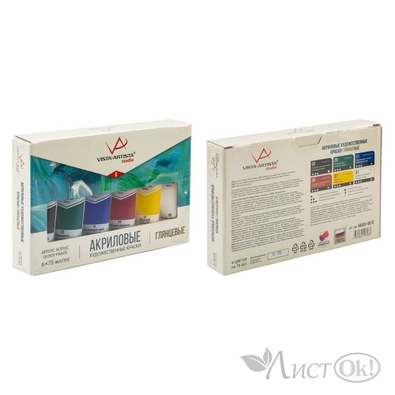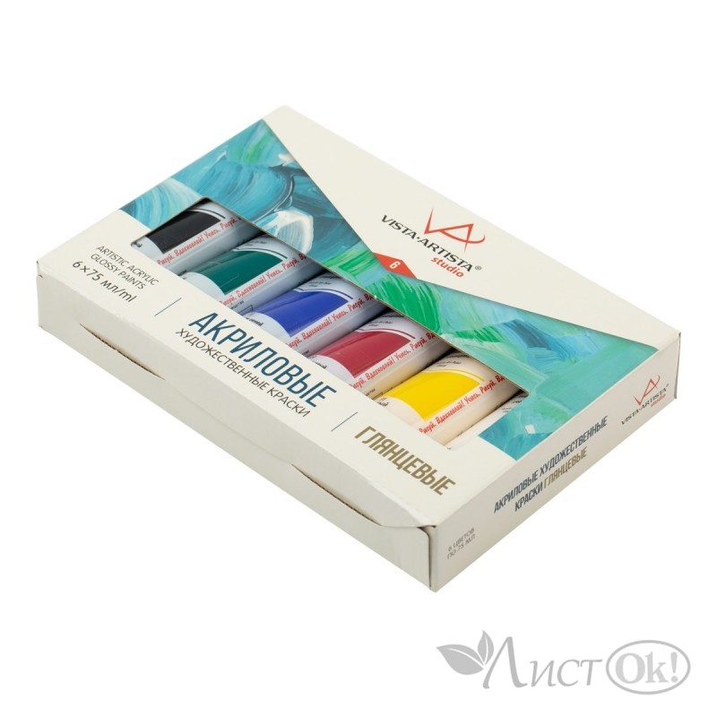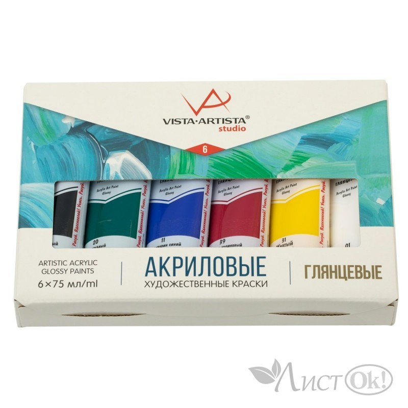 Краска акрил. 6 цв. 75 мл. глянцевые, туба, Набор Studio VAAGS-0675 "VISTA-ARTISTA"
