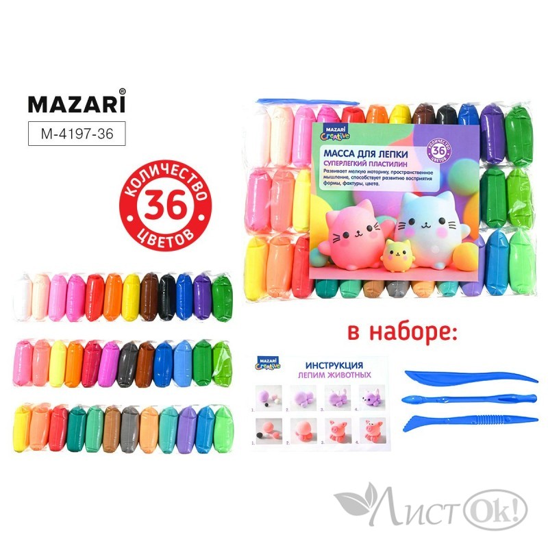 Пластилин Легкий, 36 цв. по 12 г, пластиковые стеки 3 шт в комплекте, ОПП-упаковка M-4197-36 MAZARI
