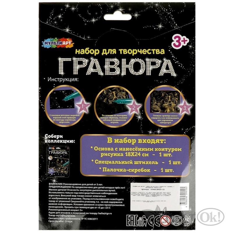 С помощью данного набора юный художник сможет создать эффектную золотистую картину на чёрном фоне. Контур рисунка уже нанесён на основу, остаётся только процарапать изображение специальным штихелем. Можно не повторять каждую черточку, главное - соблюдать направление штриха! Готовая поделка станет отличным вариантом для подарка близким или для украшения интерьера комнаты.