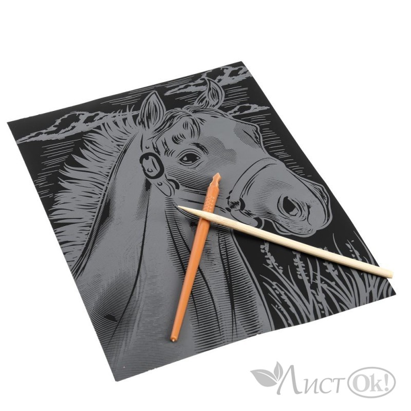 С помощью данного набора юный художник сможет создать эффектную блестящую картину на чёрном фоне. Контур рисунка уже нанесён на основу, остаётся только процарапать изображение специальным штихелем. Можно не повторять каждую черточку, главное — соблюдать направление штриха! Готовая поделка станет отличным вариантом для подарка близким или для украшения интерьера комнаты.
