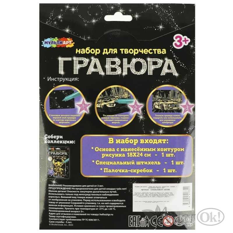 С помощью данного набора юный художник сможет создать эффектную золотистую картину на чёрном фоне. Контур рисунка уже нанесён на основу, остаётся только процарапать изображение специальным штихелем. Готовую поделку можно подарить близким или использовать для украшения интерьера.