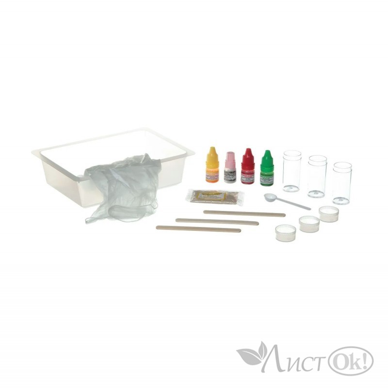 Внутри: порошок семян подорожника, 3 пакетика для хранения, 3 палочки, 3 колбы, ложка, желтый краситель, красный краситель, зеленый краситель, контейнер для микроволновой печи, перчатки, блестки, инструкция. Возраст: 8+