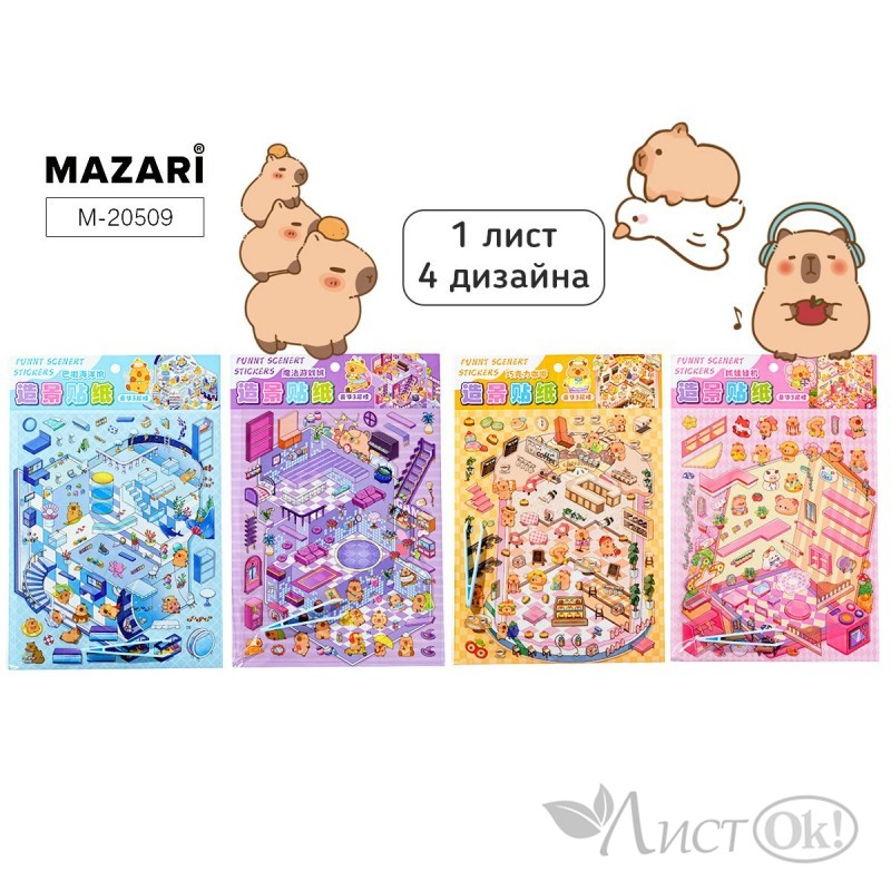 Наклейки 19*28 см, РУМБОКС КАПИБАРА, 1 локация, 1 лист с наклейками, пинцет в комплекте, 4 диз. ОПП-уп. M-20509 MAZARI